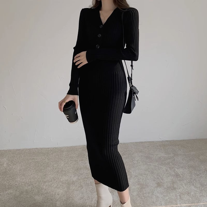Rochie casual din tricot, cu decolteul in V, are maneci lungi, nasturi in fata si croi mulat.