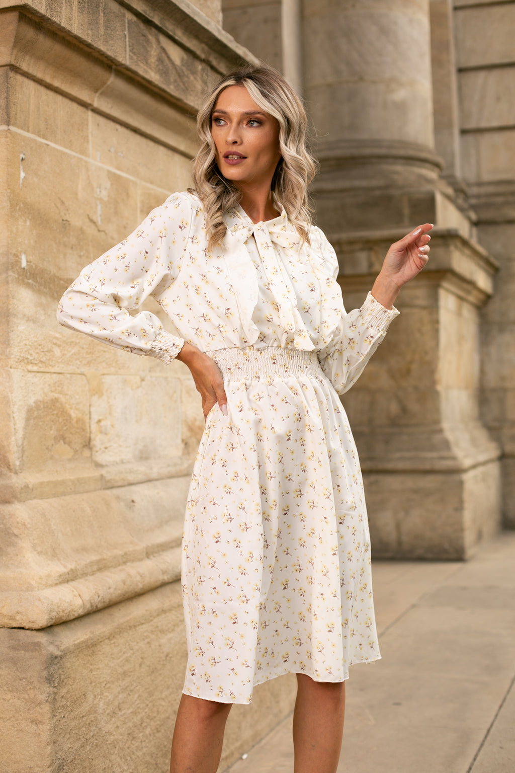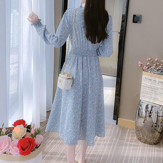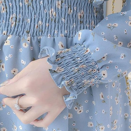 Rochie midi din voal, cu un imprimeu floral deosebit, fara captuseala. Are volanase la maneca. Decolteul e accesorizat cu o panglica ce se leaga tip fundita.