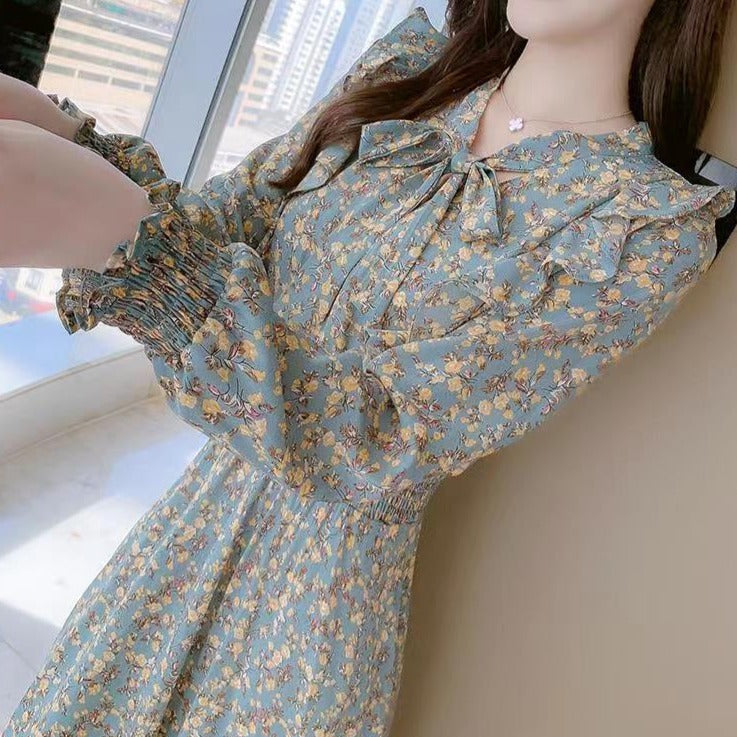 Rochie Silvy verde cu imprimeu floral si decolteu accesorizat cu nod