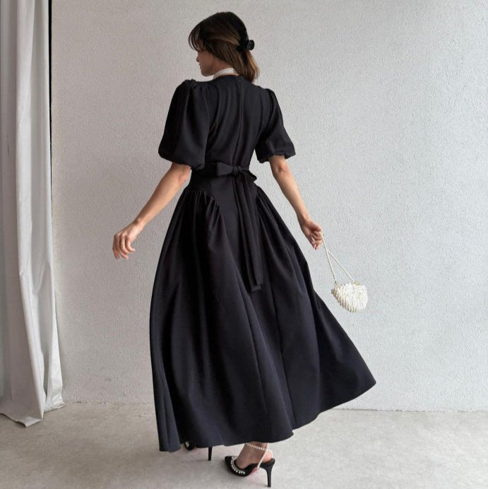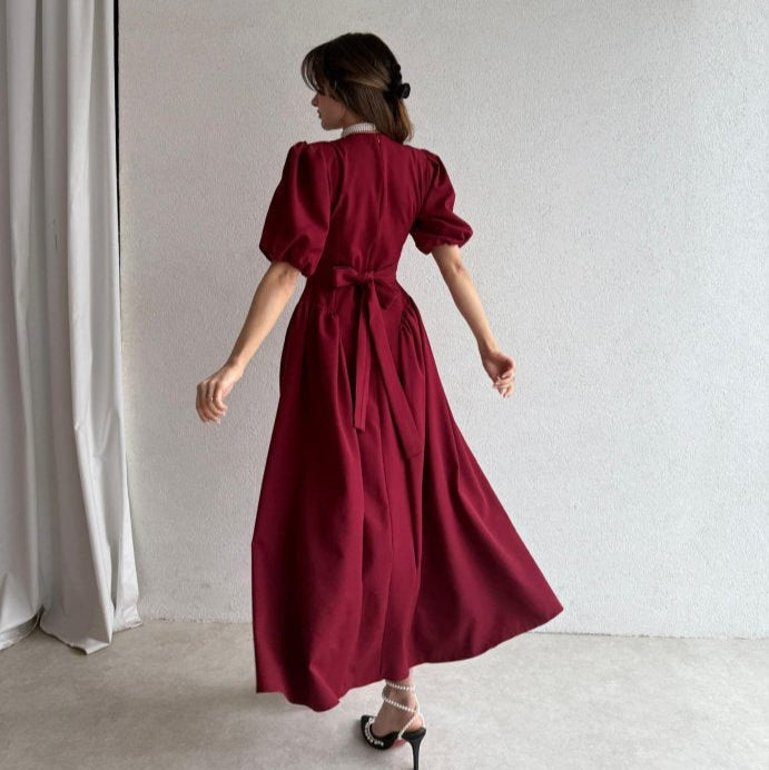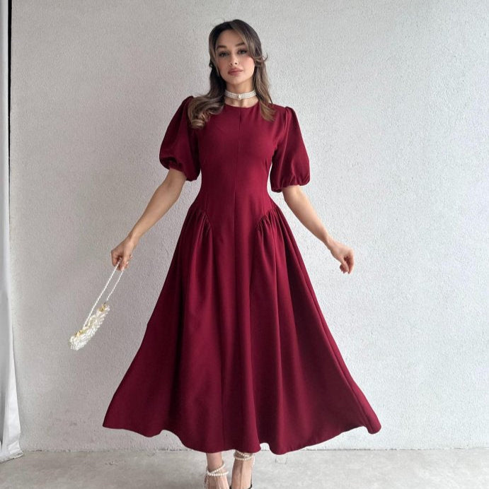 Rochie midi stil casual-chic cu maneci scurte bufante si talie accentuata prin cordon la spate.