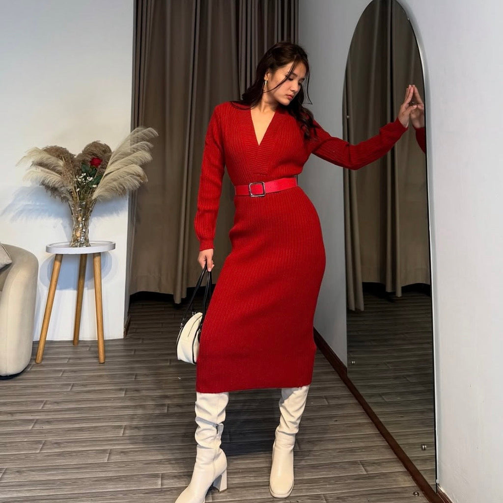 Rochie din tricot moale si elastic, calduroasa, cu o croi mulat. Prezinta detalii reiate, maneci lungi, iar in partea de sus prezinta decolteu in V. Cureaua este inclusa