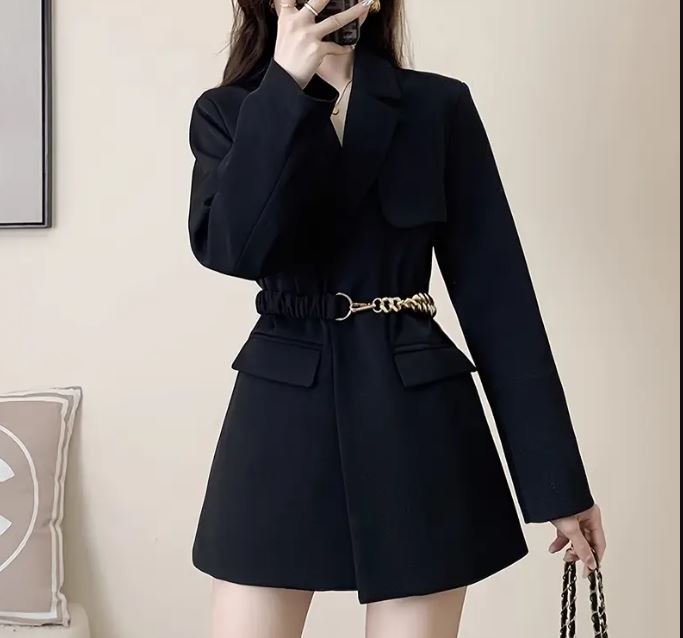 Sacou dama elegant cu maneci lungi si umeri buretati. Are buzunare cu clapa, prezinta talie accentuata printr-o curea din lant.
