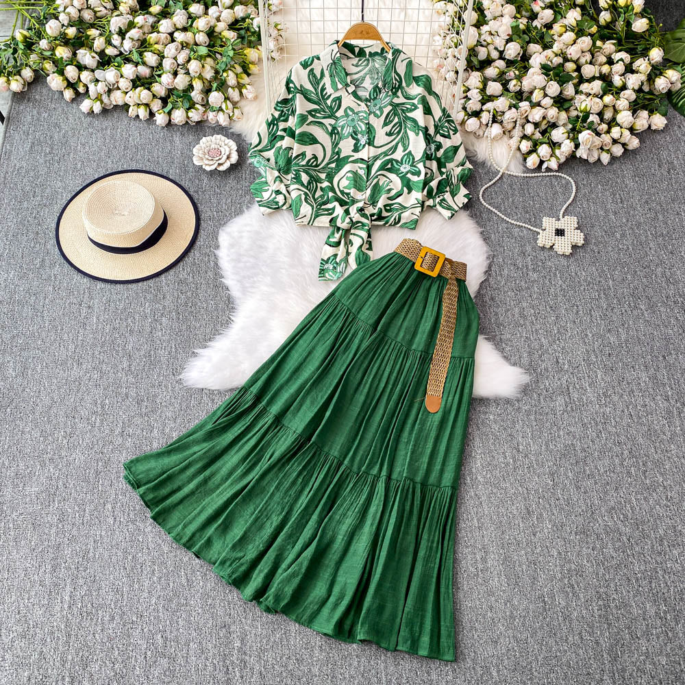 Fusta e confectionata din voal si prezinta o banda elastica si curea. Camasa este cu maneci 3/4, confectionat din voal. Prezinta sistem de inchidere cu nasturi si imprimu floral.