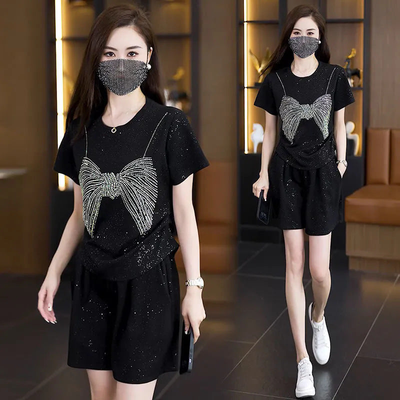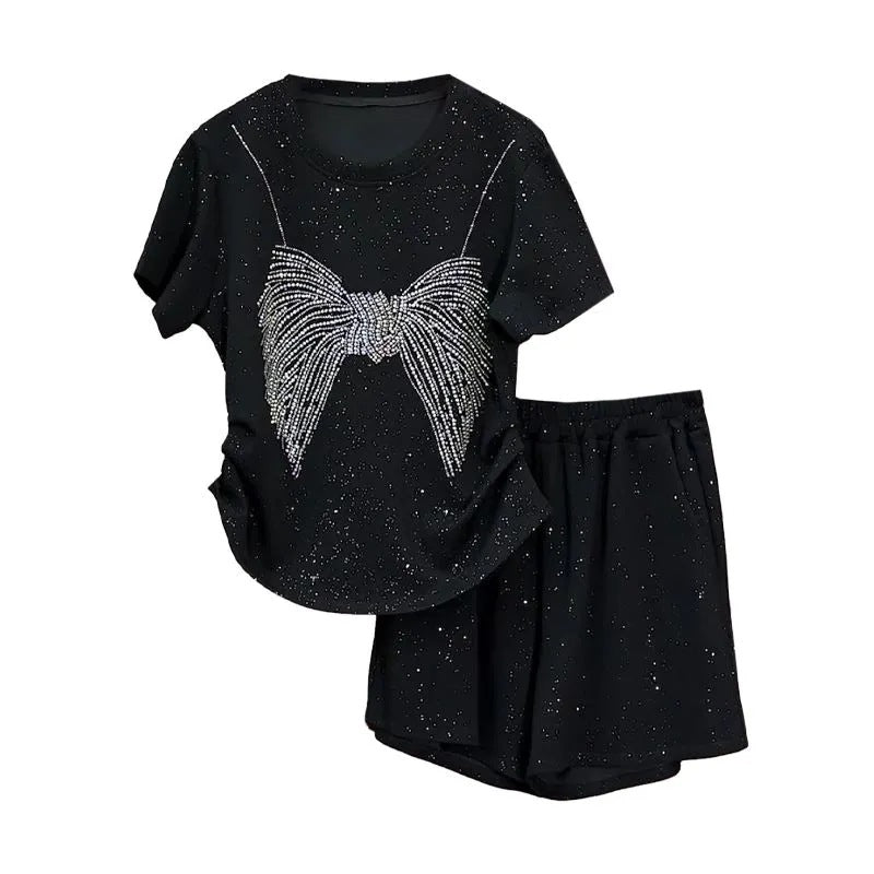 Set compus din doua piese, pantaloni surti si tricou cu detalii din pietre strass. Poate fi purtat pentru tinute casual.