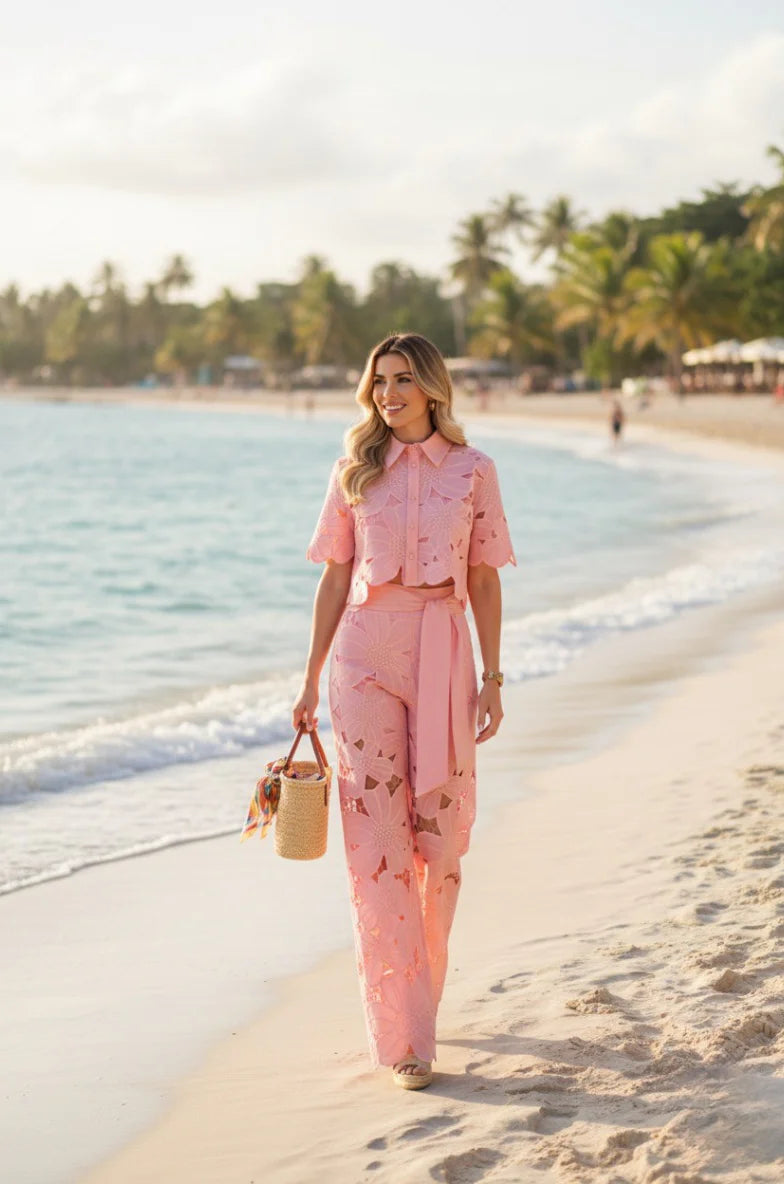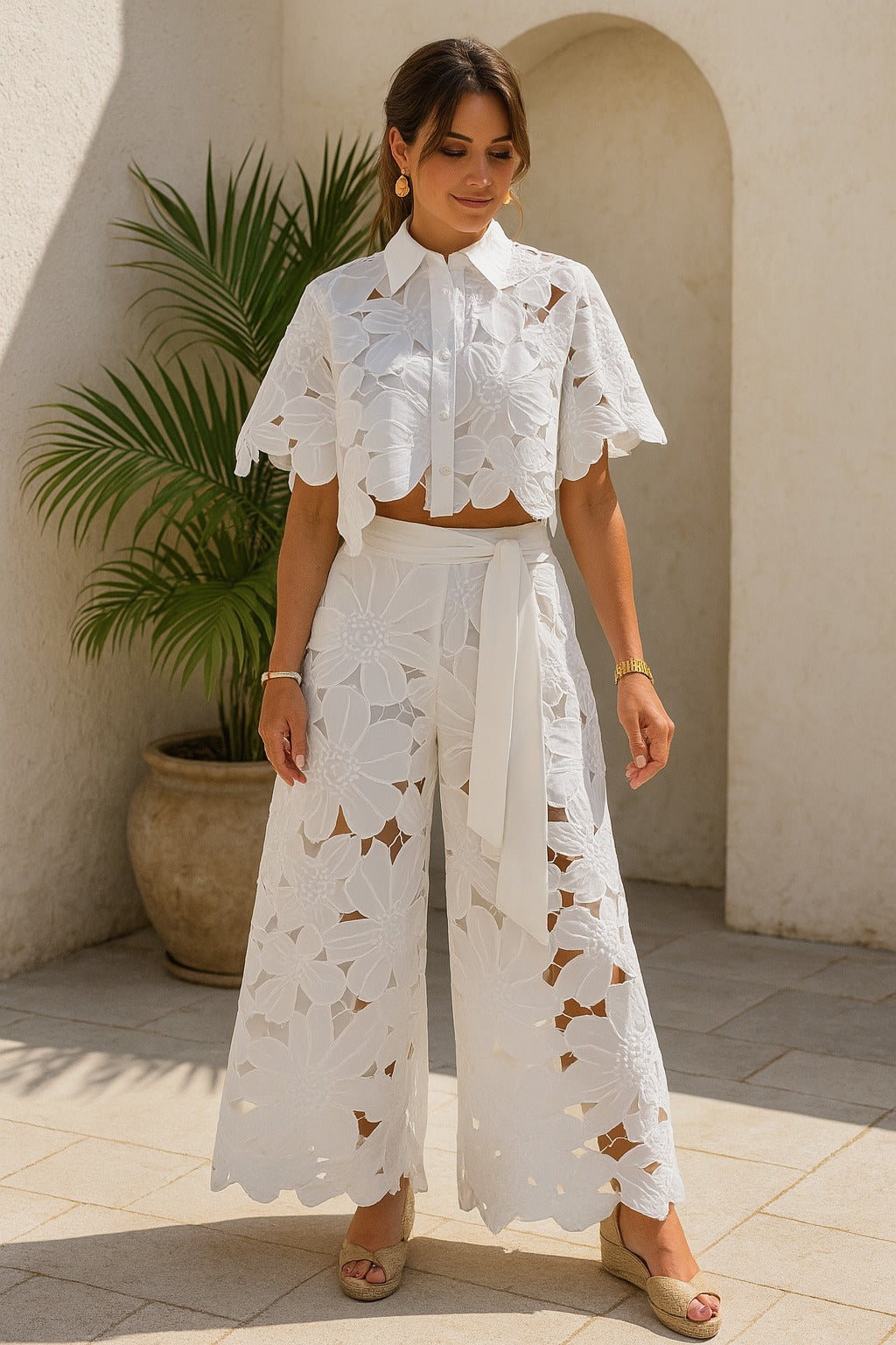 Set compus din pantaloni si camasa. Pantalonii sunt drepti cu talie inalta, cu talie accentuata prin cordon detasabil. Camasa prezinta maneci scurte si inchidere prin nasturi. Setul se remarca prin broderia florala.