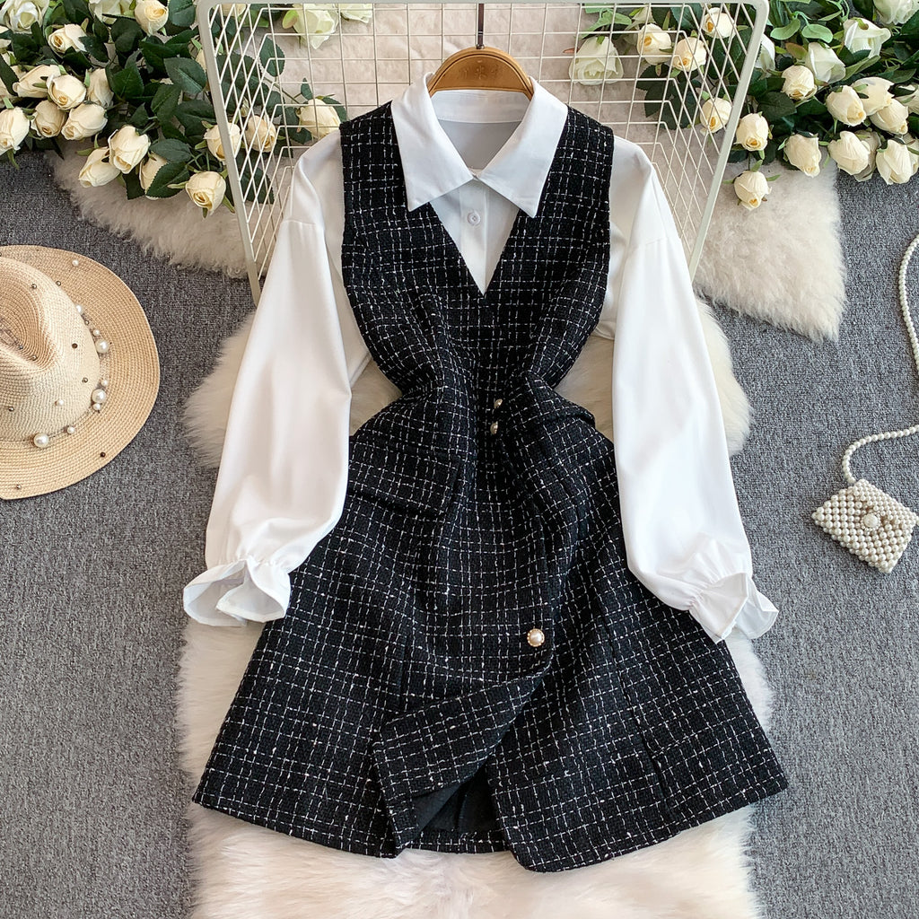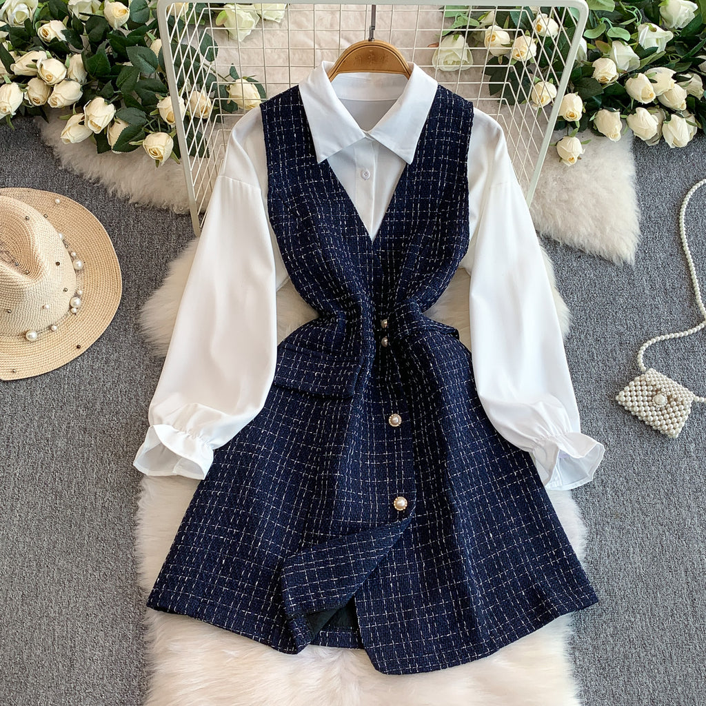 Set elegant compus din rochie si camasa. Rochia e din tesatura texturata din fir boucle, decolteu in V, fara maneci, accesorizata cu nasturi aurii stralucitori.