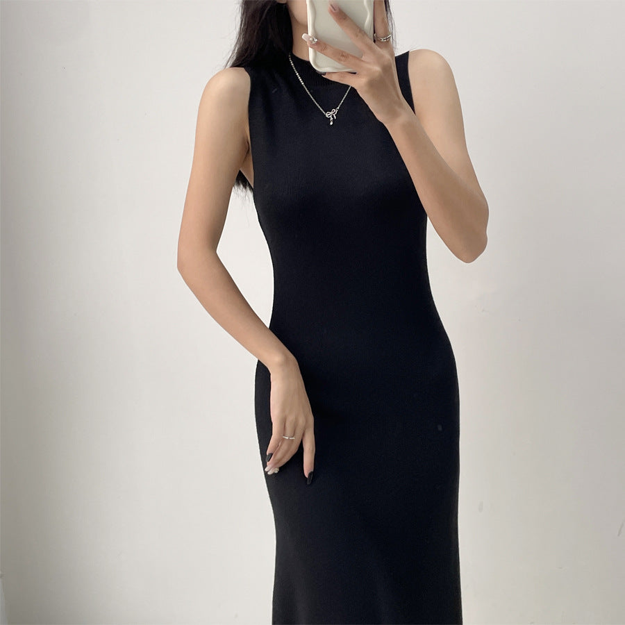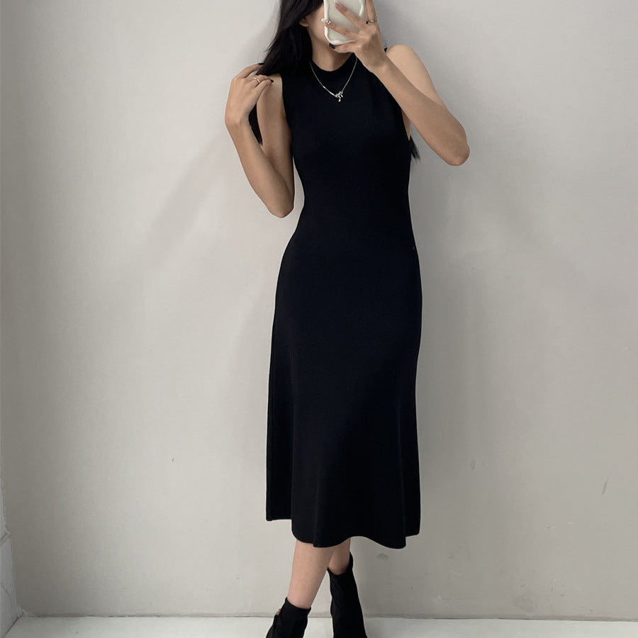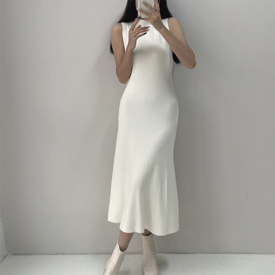 Rochie din tricot reiat, cu croi usor mulat, lungime midi, cu guler inalt