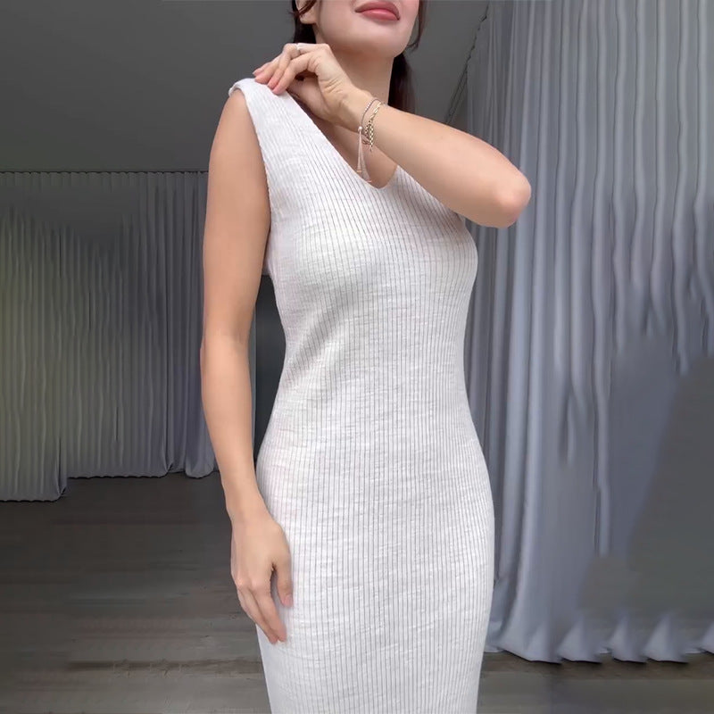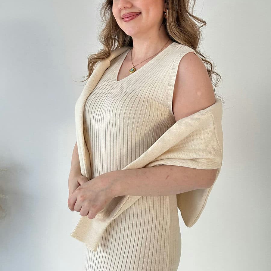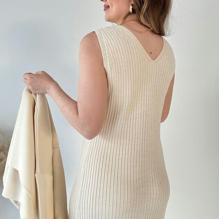 Rochie din tricot reiat, cu croi usor mulat, lungime midi, cu bretele late si decolteu in V.