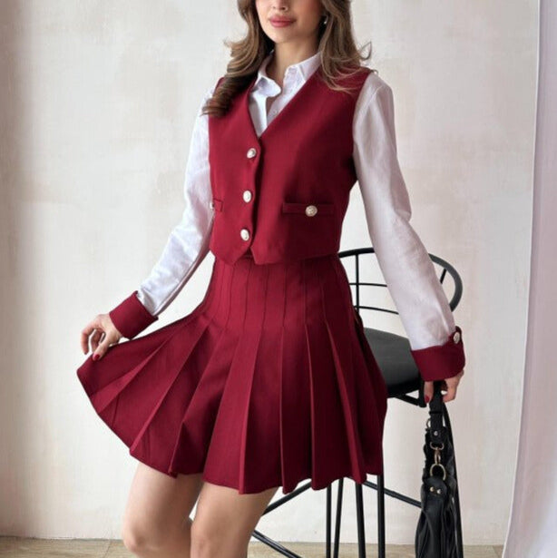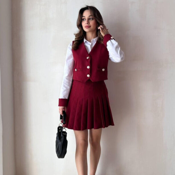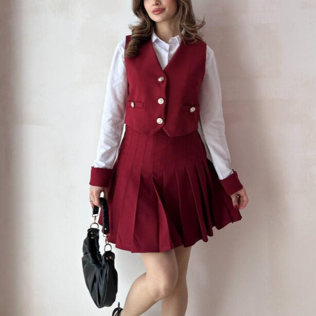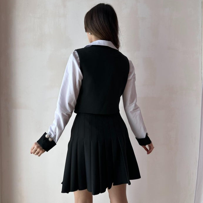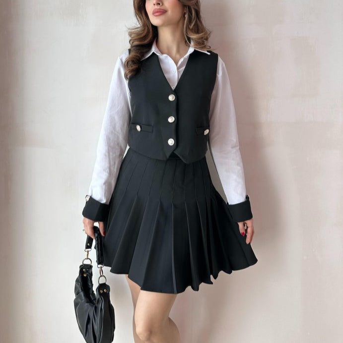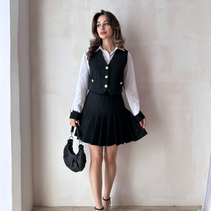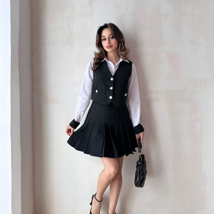 Set compus din 3 piese: fusta, vesta si camasa. Camasa eleganta , croi drept, maneci lungi bufante cu manseta lata cu nasturi. Fusta prezinta inchidere tip fermoar si pliuri late.