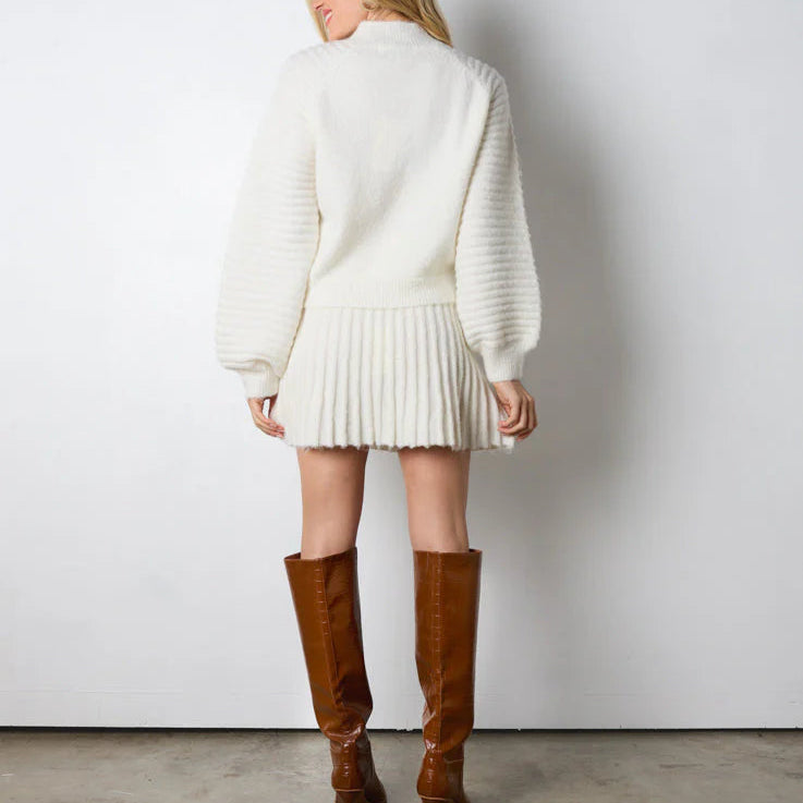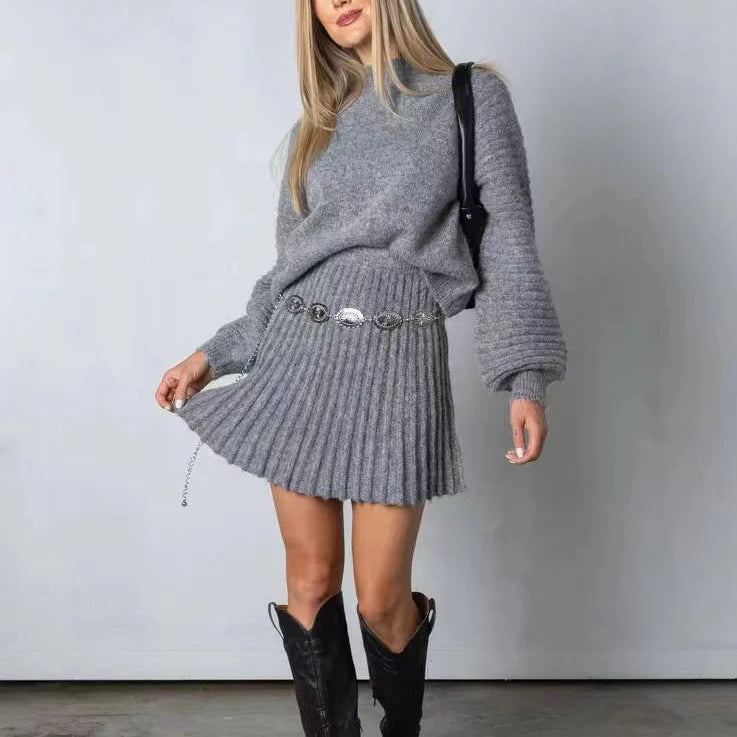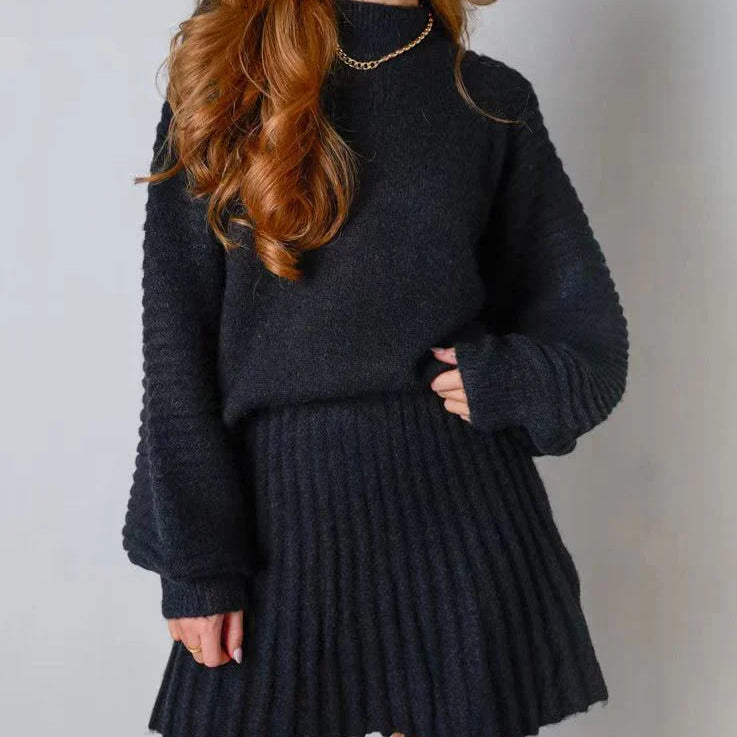 Set din material placut, calduros si elastic, croiala lejera. Setul e compus din bluza cu maneci lungi si fusta de mini