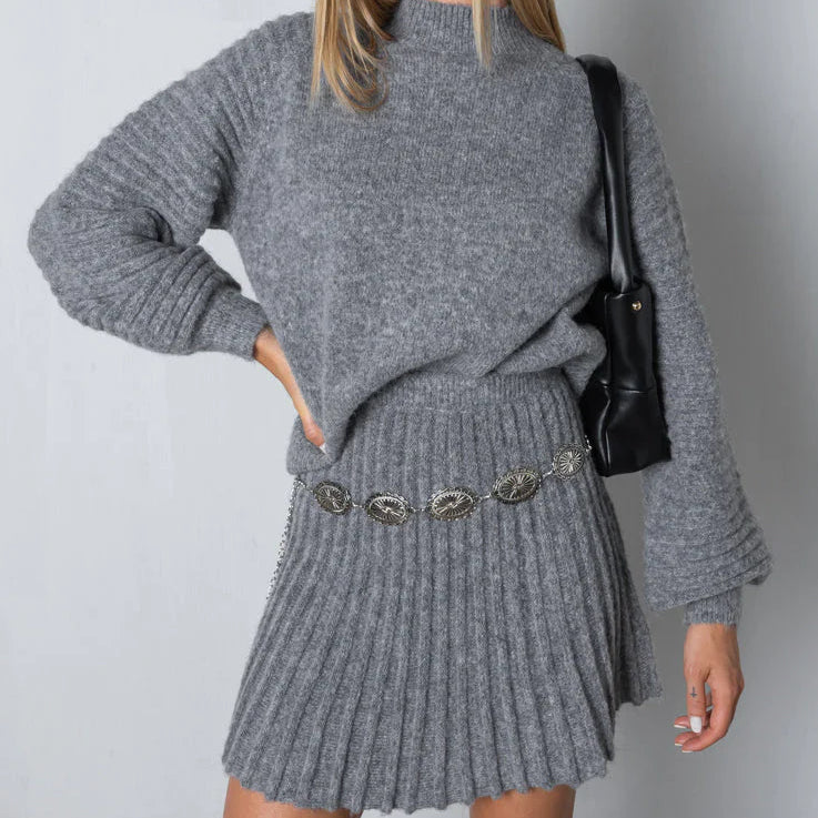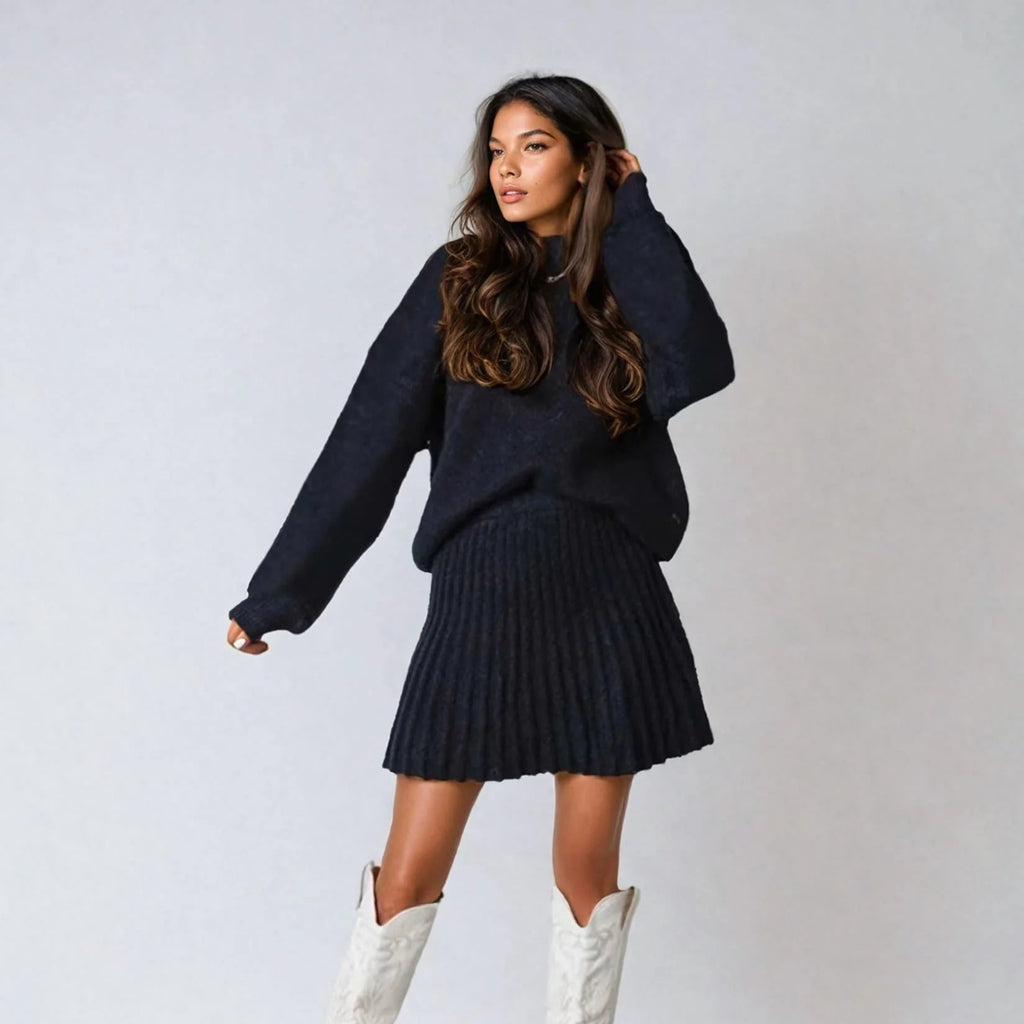 E un set perfect pentru sezonul rece, se poate asorta in tinute elegante cu mantou peste si tocuri inalte sau in tinute casual cu cizme lungi si geaca de piele.
