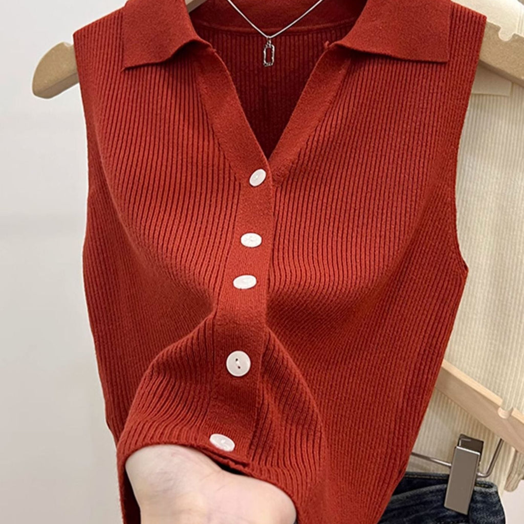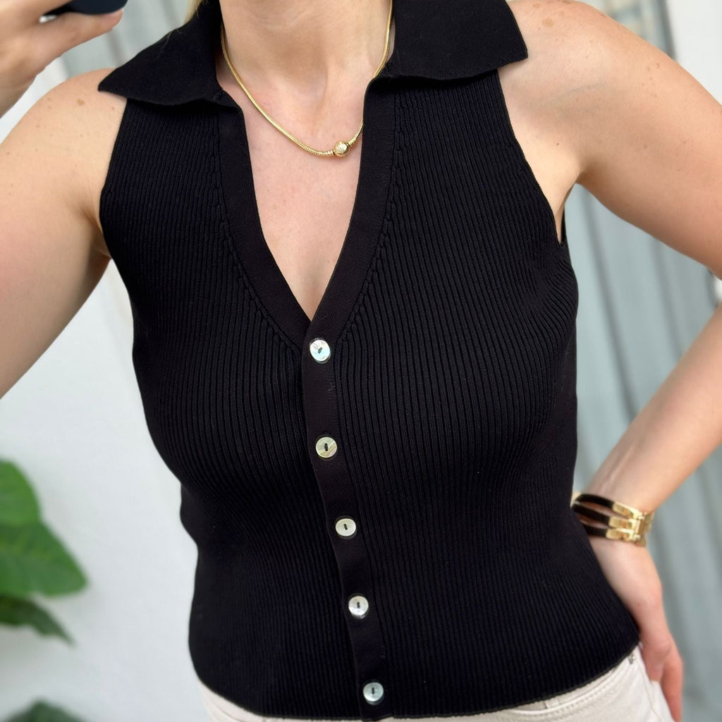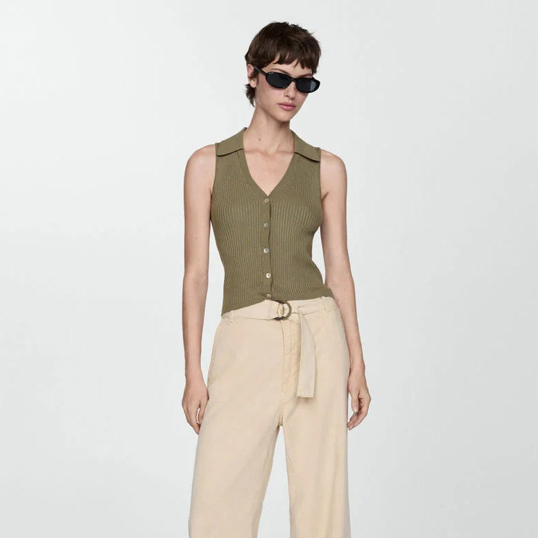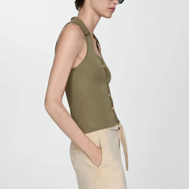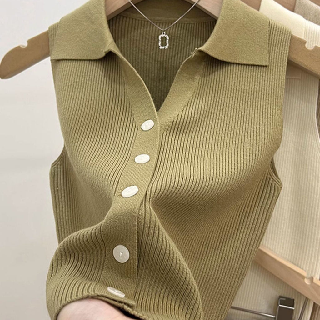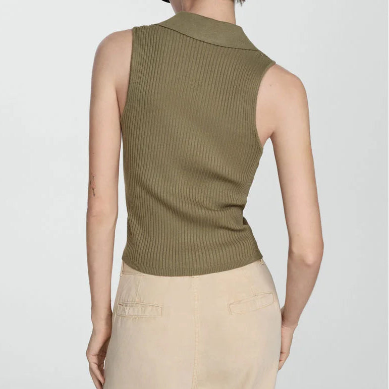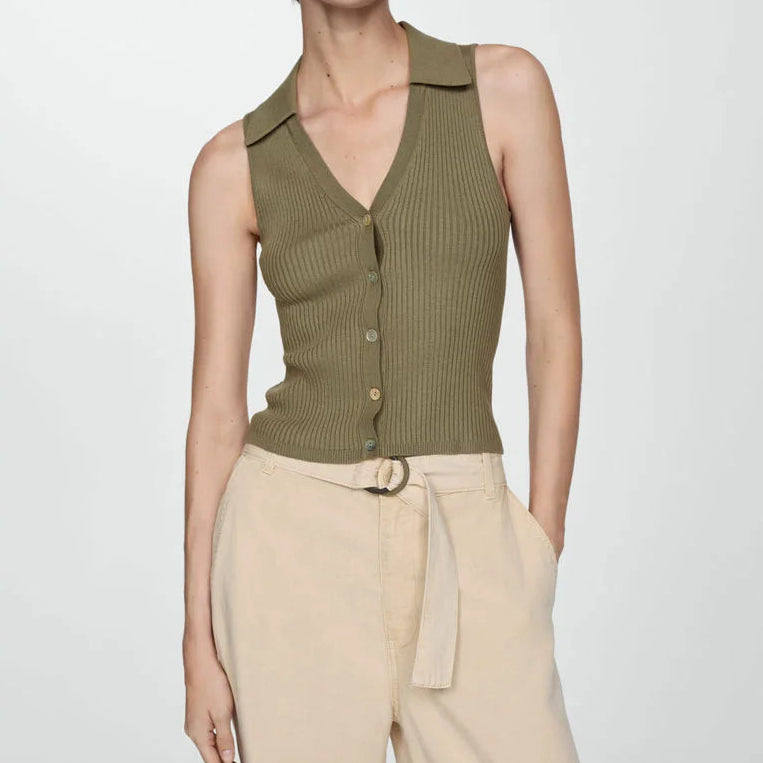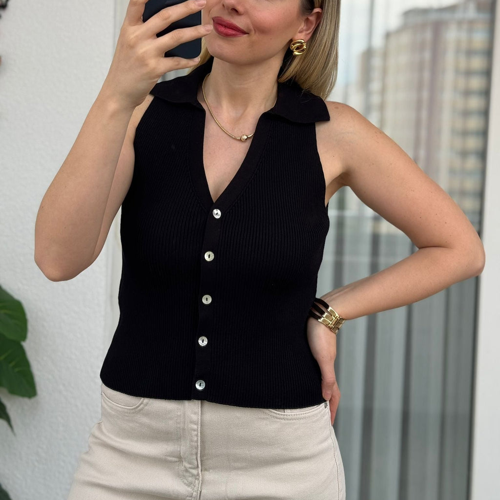 Top casual din tricot reiat fara maneci, cu guler si nasturi functionali.