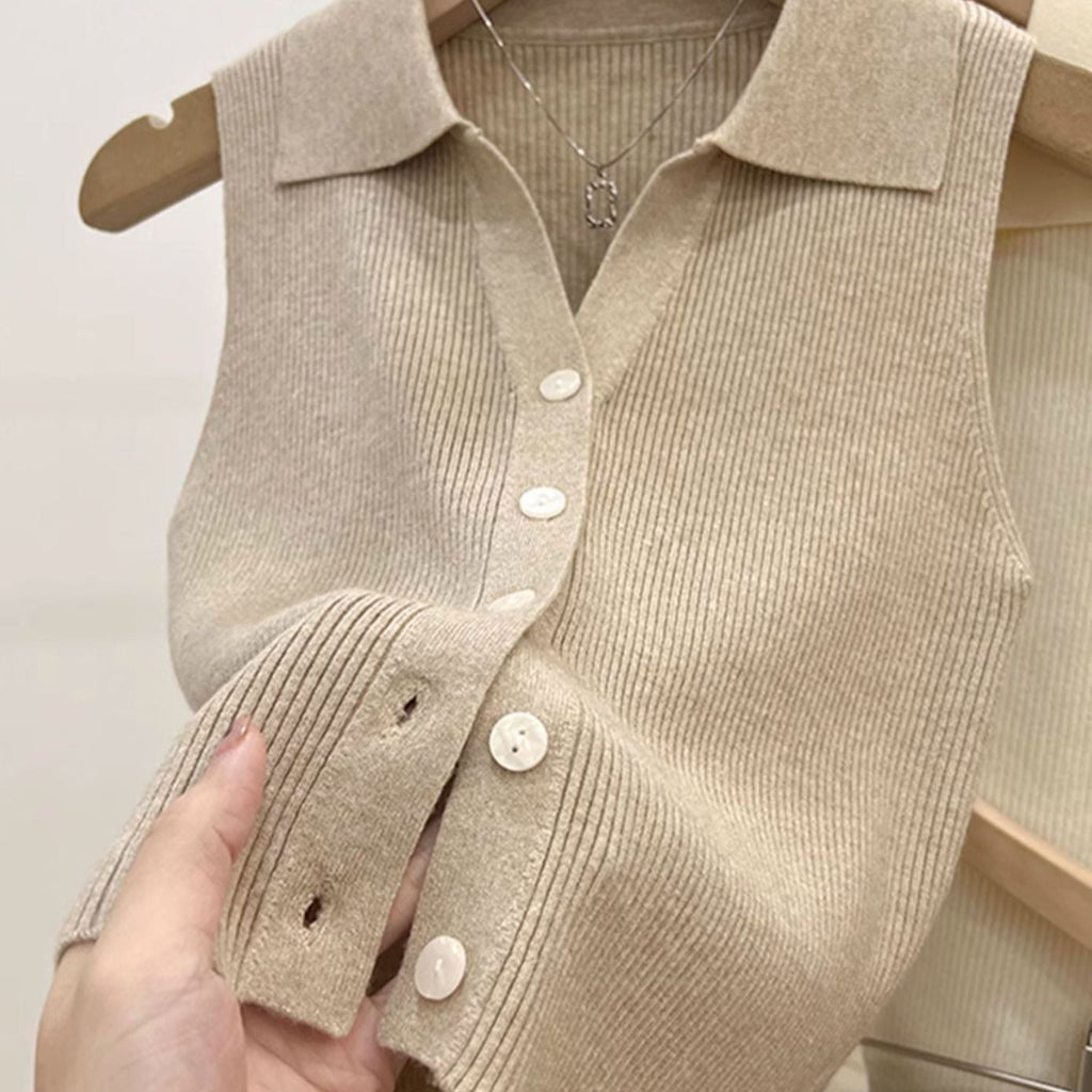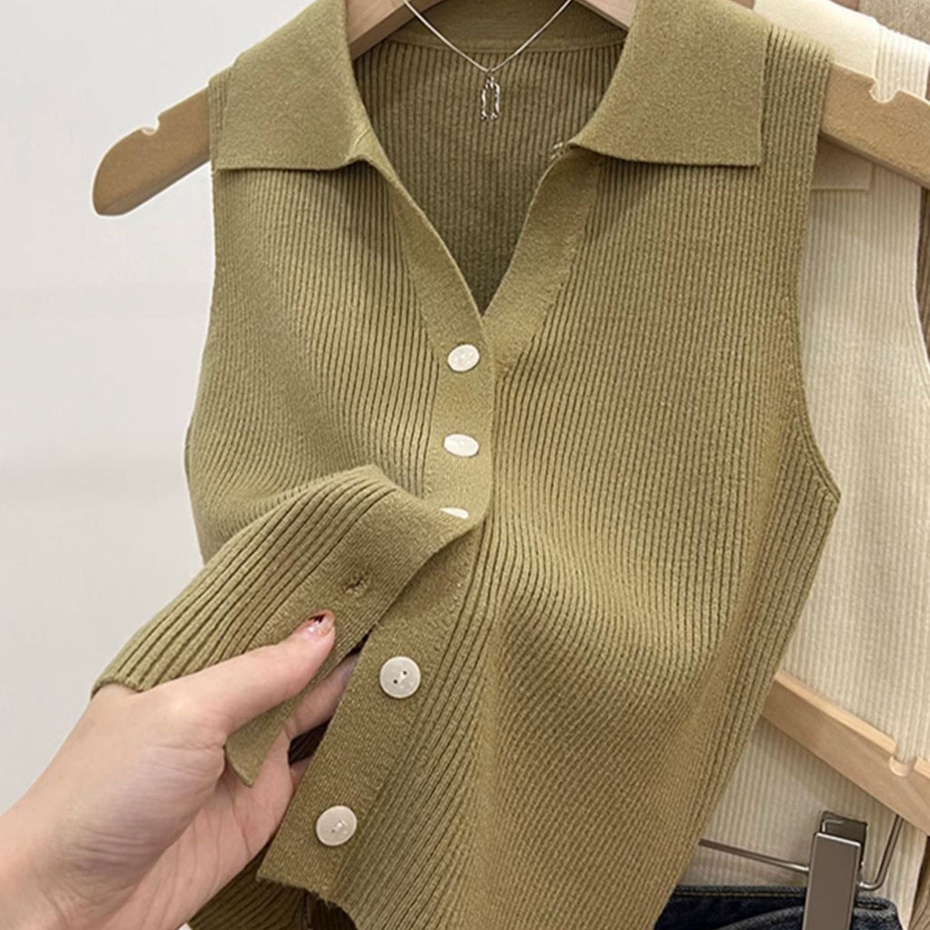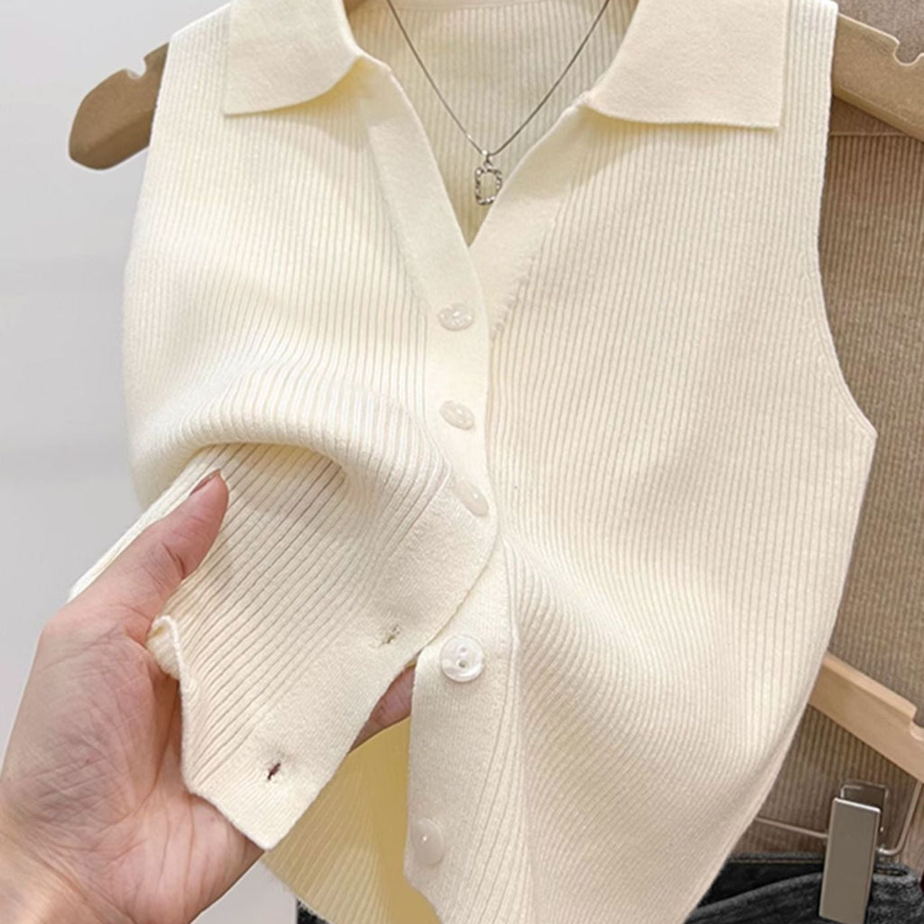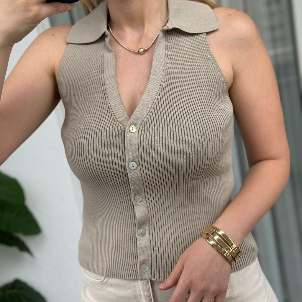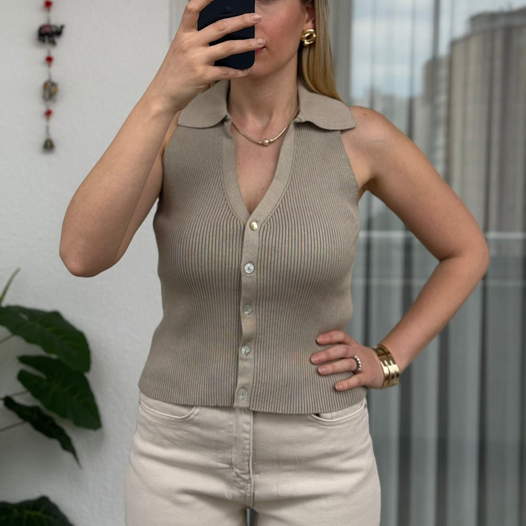 Top casual din tricot reiat fara maneci, cu guler si nasturi functionali.