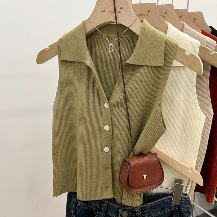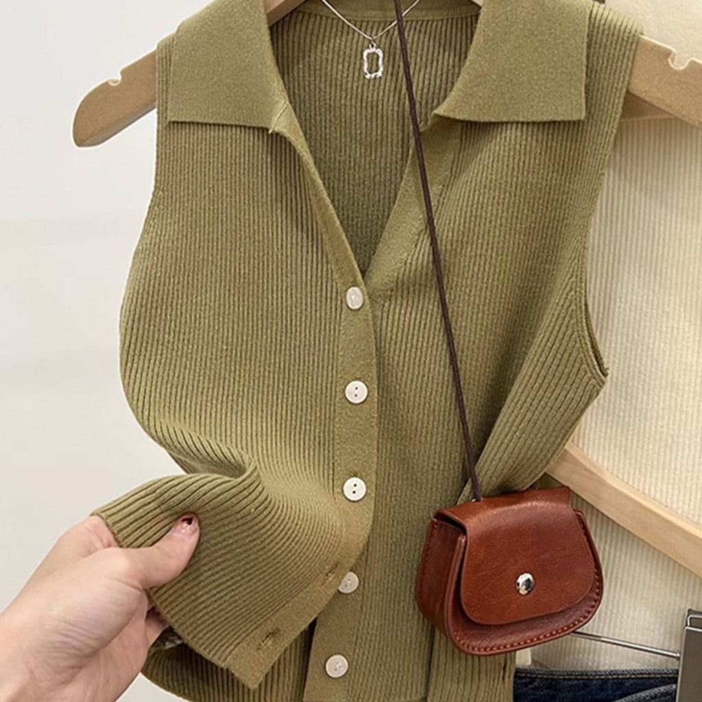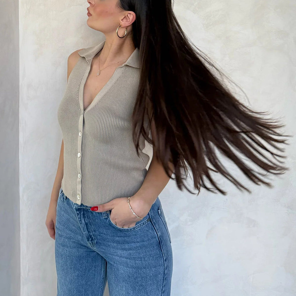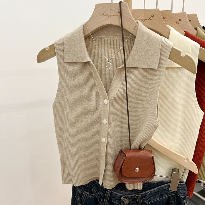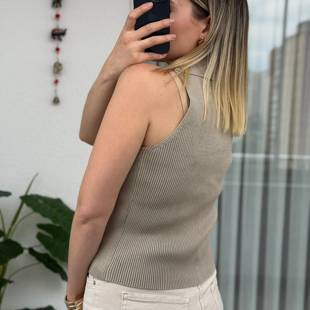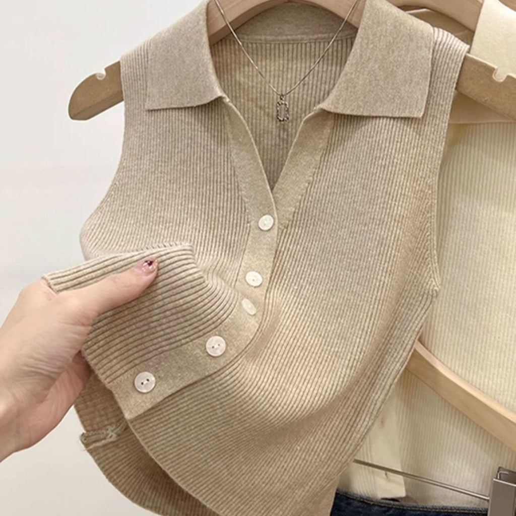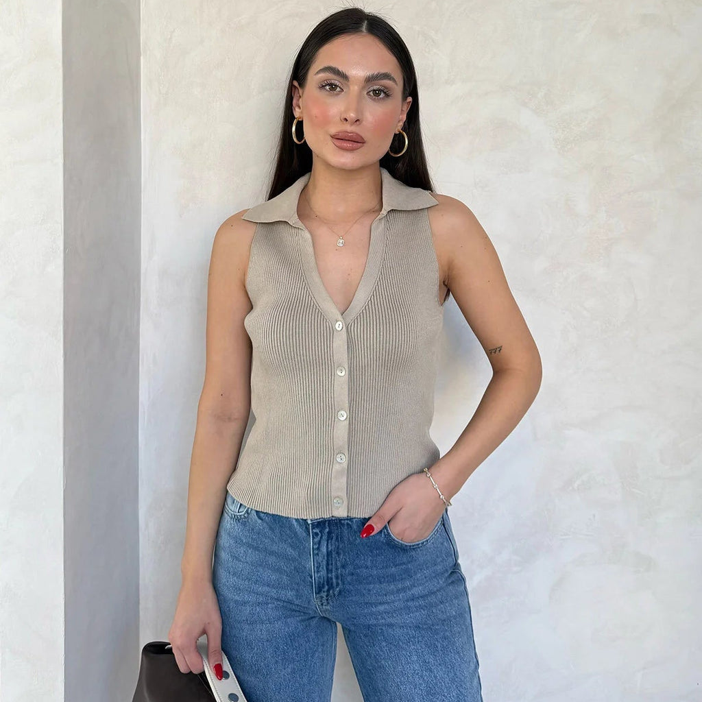 Top casual din tricot reiat fara maneci, cu guler si nasturi functionali.