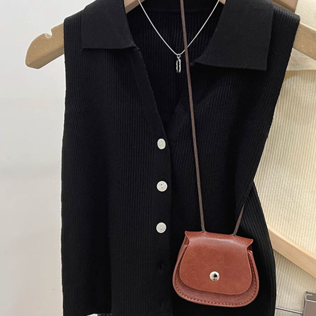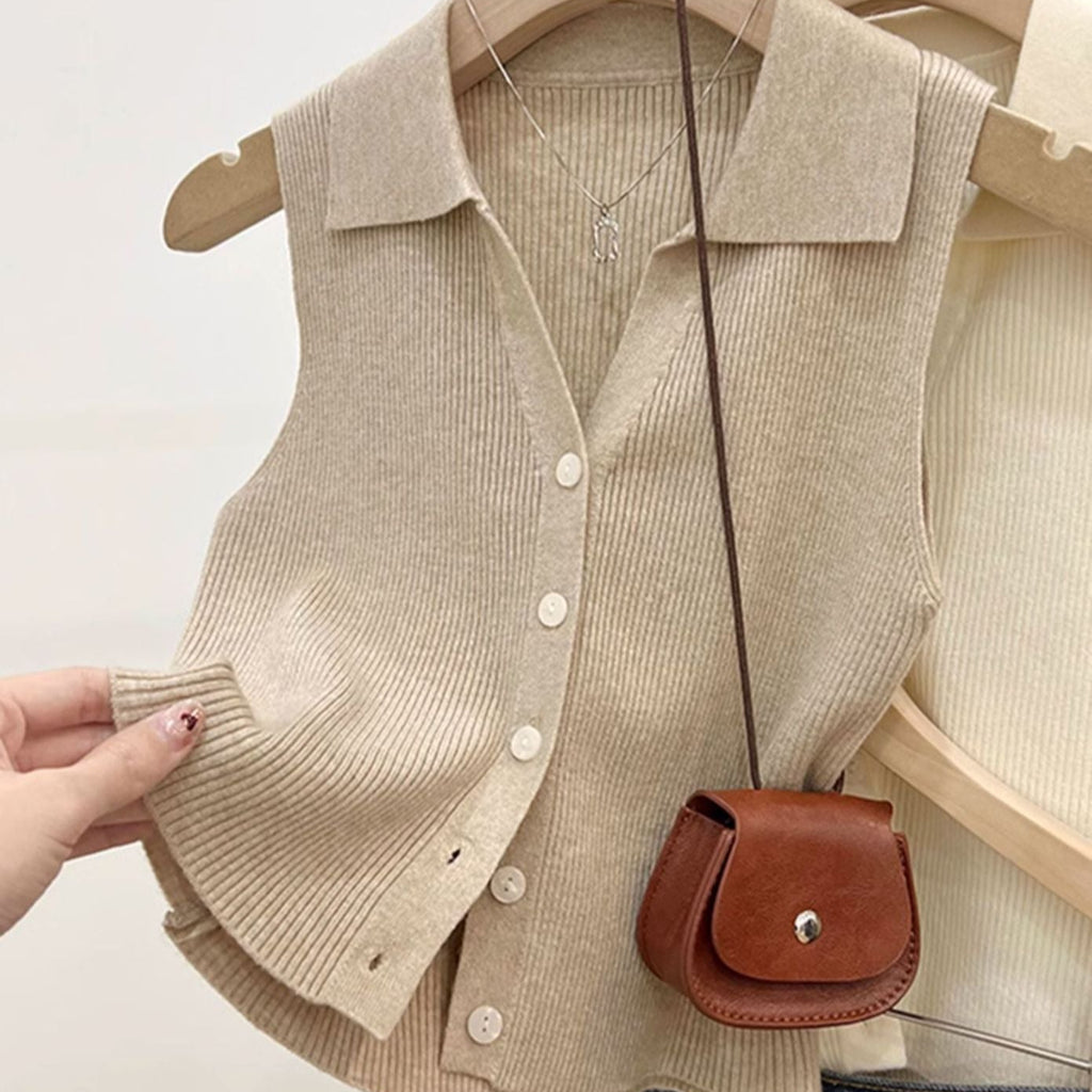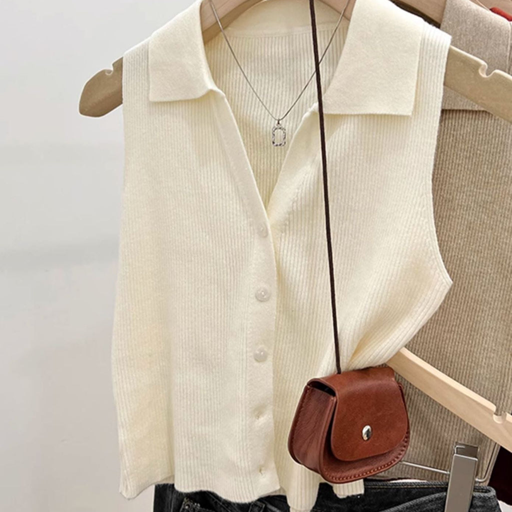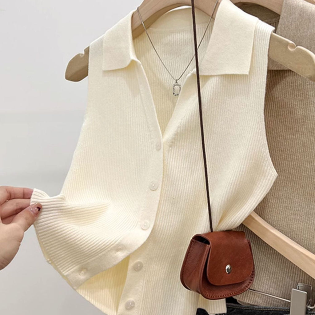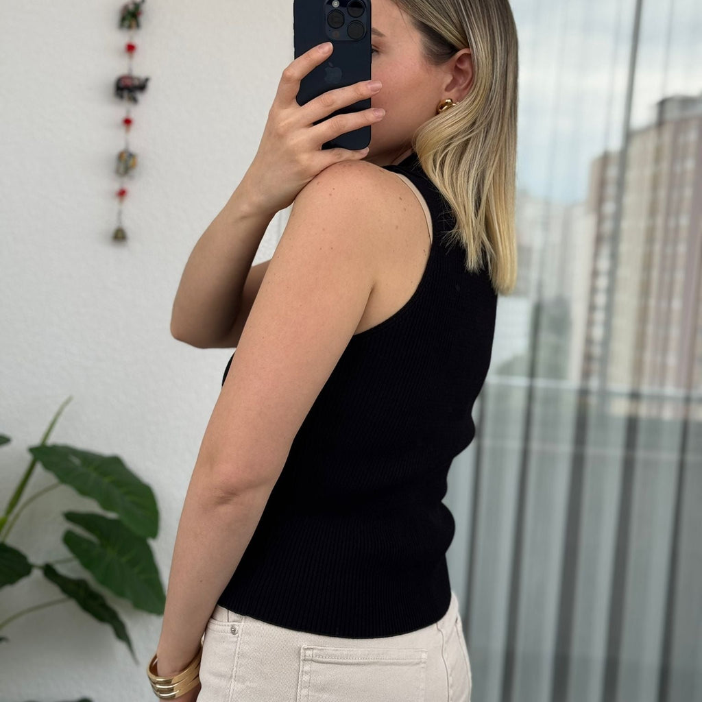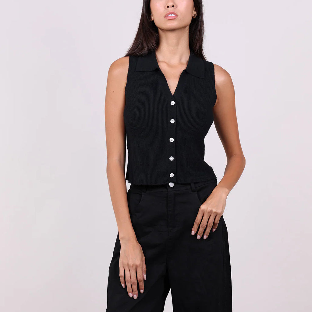 Top casual din tricot reiat fara maneci, cu guler si nasturi functionali.