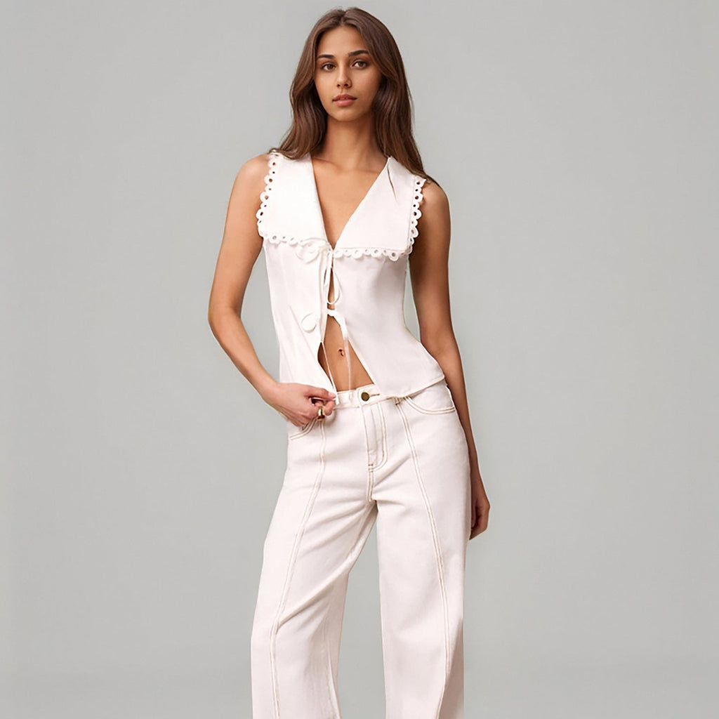 Top cu inchidere prin snur dublu, decolteu in V si guler lat cu terminatii din dantela. Topul se poate purta cu o pereche de pantaloni eleganti sau cu o pereche de blugi fiind potrivita atat pentru completarea unei tinute in stil elegat cat si casual.