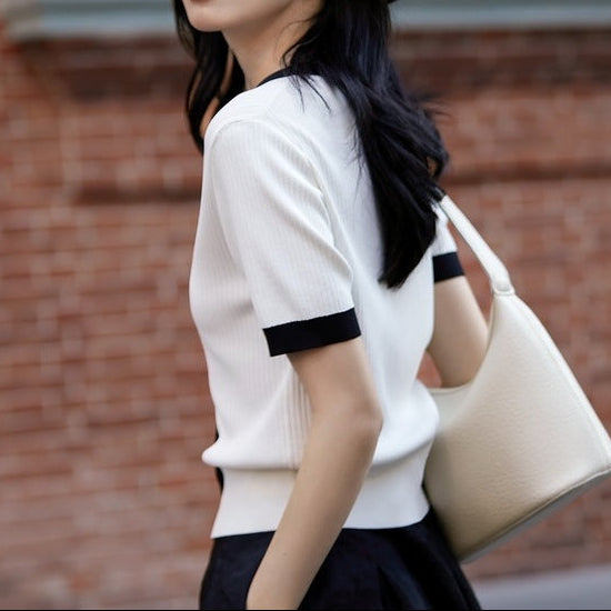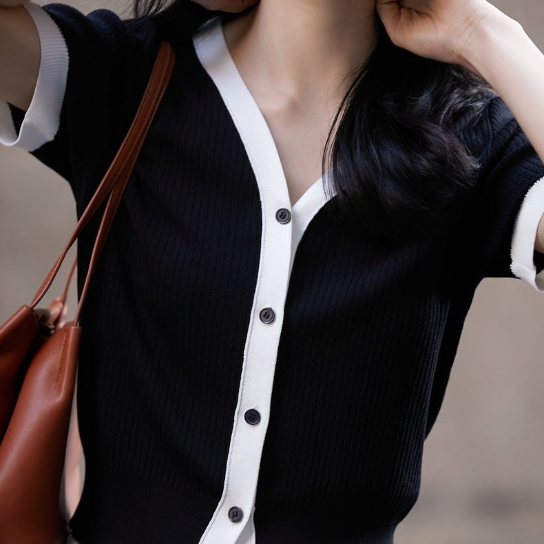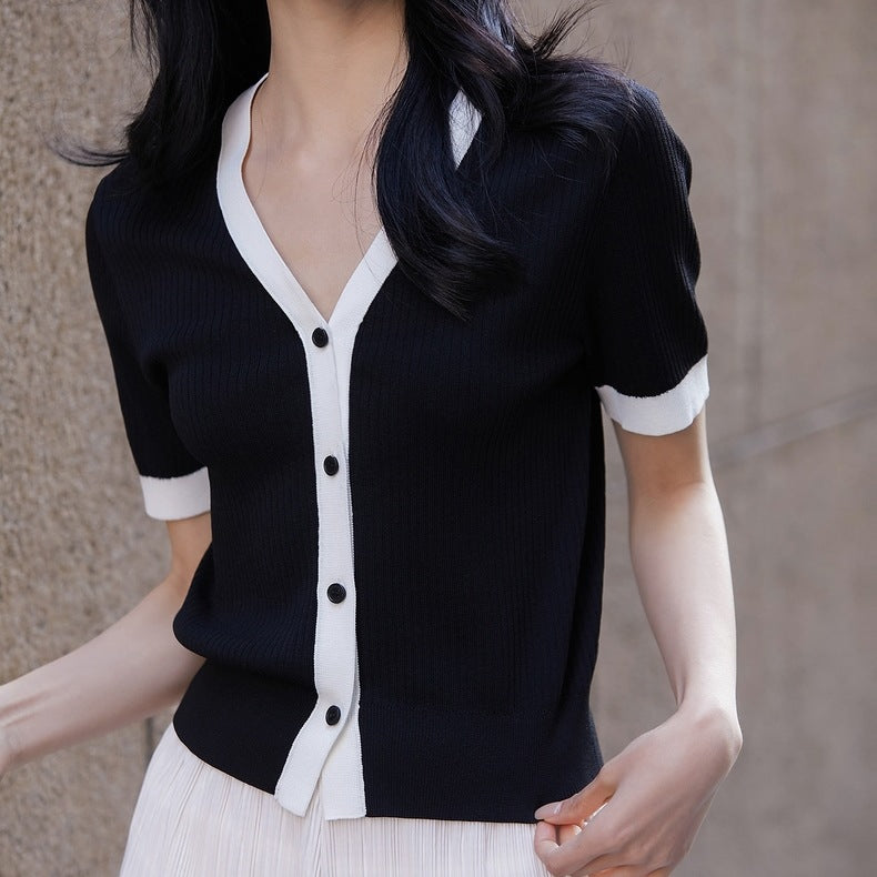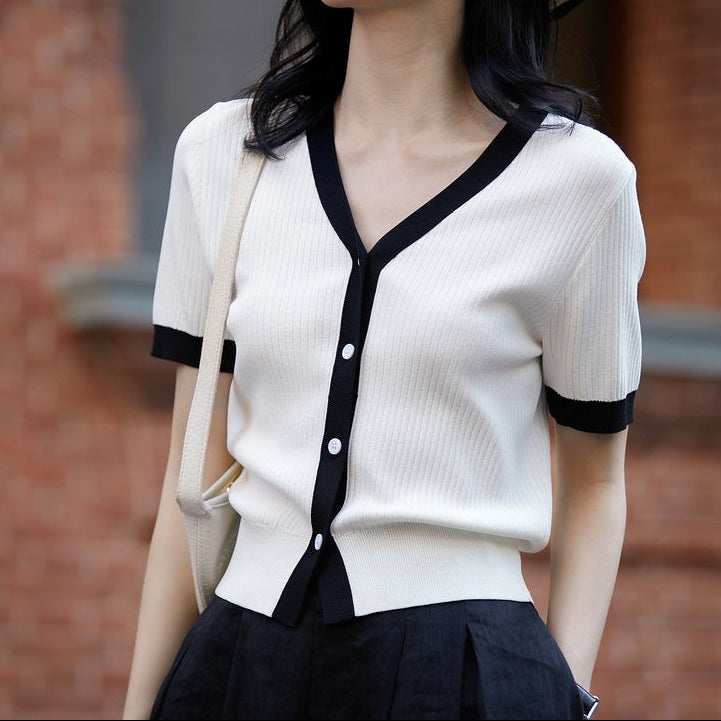 Tricou confectionat din tricot subtire, moale, cu decolteu in V si nasturi functionali.