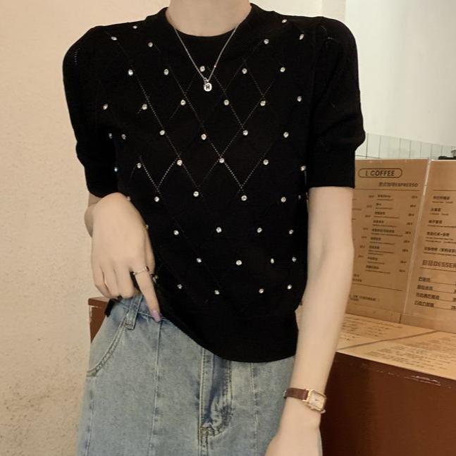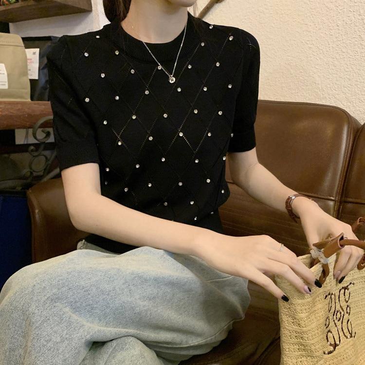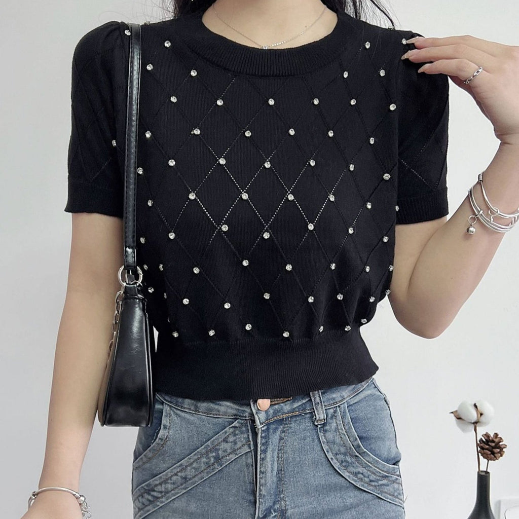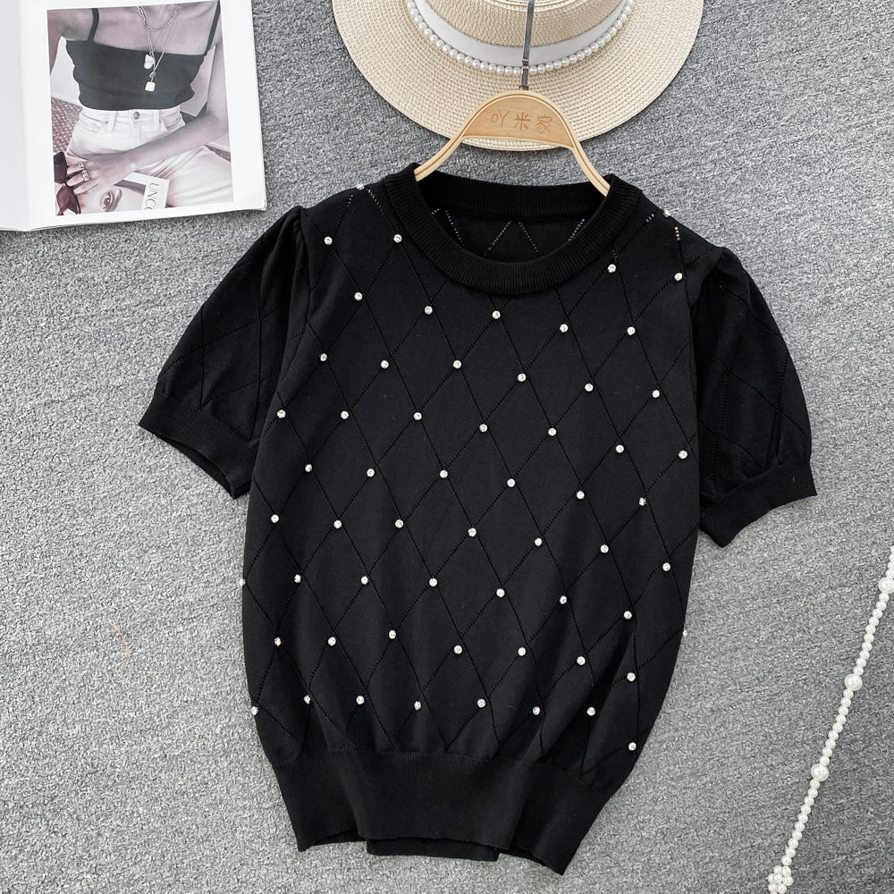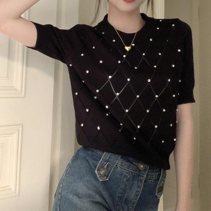Tricou confectionat din tricot subtire, moale, se remarca prin pietricelele din fata.