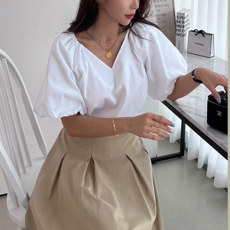 Tricou dama cu maneci scurte bufante, croi lejer, cu decolteu in V.